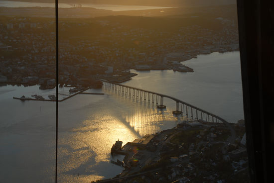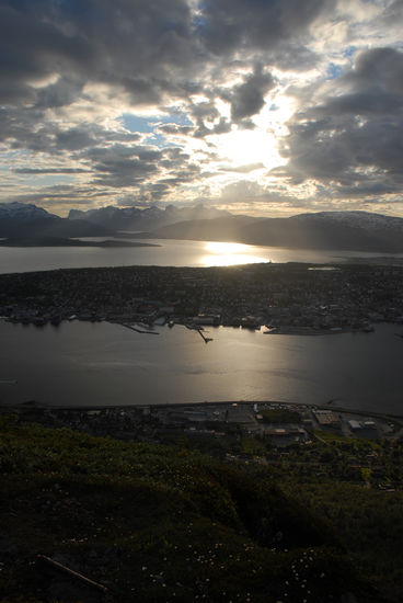Später am Abend nehmen wir noch den öffentlichen Bus der uns zum Cable Car Fjellheisen (NOK 120,- p.P. / € 16,-) auf den 420 m hohen Storsteinen bringt. Von hier aus hat man einen einmaligen Panoramablick auf Tromsö.