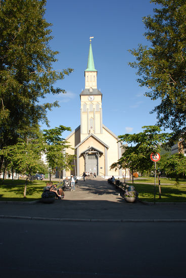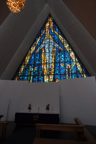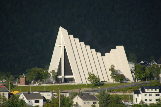 Weiter geht`s quer durch die Stadt, über die Tromsöbrua – eine 1016 m lange Brücke, welche das Festland mit der Insel Tromsöya verbindet – zum bekanntesten Wahrzeichen von Tromsö: die 1965 geweihte Eismeerkathedrale. Ein dreieckiges architektonisches Meisterwerk das an die charakteristischen Trockenfischgestelle erinnert. Auch hier verlangen sie Eintritt für die Kirche, wie fast überall in Norwegen (NOK 35,- p.P. / € 4,80).