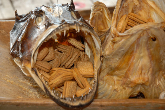 Aber noch besser finden wir A (kürzeren Ortsnamen gibt`s nirgends mehr) mit seinem Torrfiskmuseum. Um NOK 50,- (€ 6,80 p.P.) gibt es eine total interessante Führung inklusive Film, Kaffee und Keksen (liegen in einem Trockenfischkopf). Der Besitzer ist Fischer, ein total witziger Typ, der mindesten 6 Sprachen fließend spricht!