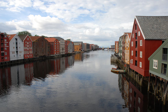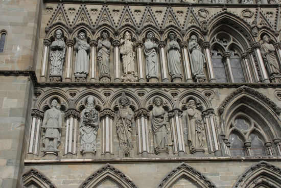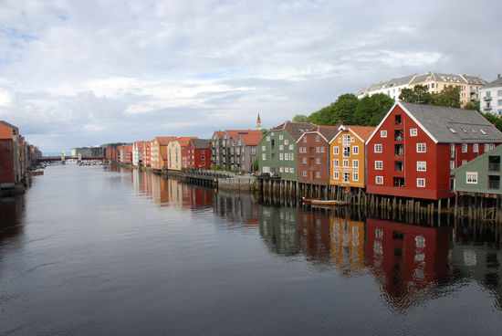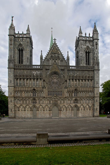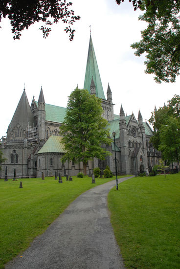 Nach einer viertel Stunde scheint schon wieder die Sonne und so spazieren wir als erstes zum Nationalheiligtum Norwegens: der Nidarosdom. Trondheim hieß früher Nidaros und war die erste Hauptstadt Norwegens (997 von Olav Tryggvason gegründet). Der Dom wurde über dem Grab Olavs erbaut und ist die größte gotische Kirche in Skandinavien überhaupt. Der Dom ist düster, aber beeindruckend, vor allem die Glasrosette über dem Westportal.