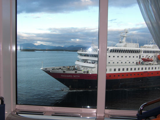 Um 10:00 ist Abfahrt und gleich darauf gibt es einen Film und Infos im Amphitheater. Unsere Kabine ist wie erwartet. Sie passt bei uns in den Vorraum und das Bad ist wie der Schuhschrank… also werden wir uns hauptsächlich draußen aufhalten. Gott sei Dank passt das Wetter, es ist nur sehr windig, und so genießen wir die vorüberziehende wunderschöne Landschaft an Deck.