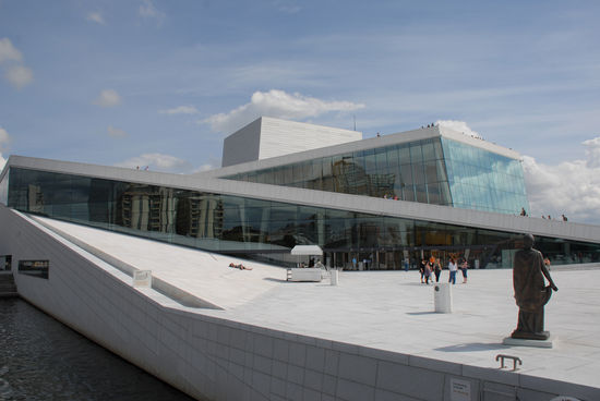 Sensationell ist die Oper von Oslo. Eine irre Konstruktion aus weißem Marmor und Holz am Wasser. Das erste Opernhaus der Welt mit begehbarem Dach. Hier bekomme ich endlich meinen Kaffee und ein Wasser – war schon fast am verdursten. Hier sind sogar die Toiletten sehenswert.