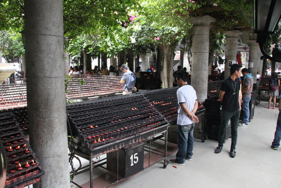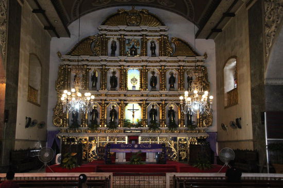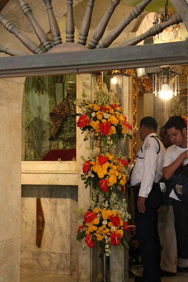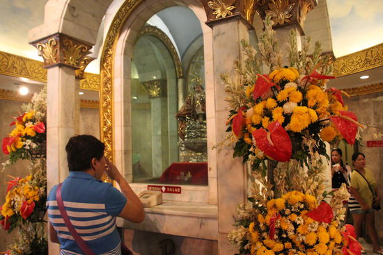 Jetzt folgt das kulturelle Highlight der Tour, bzw. Cebus. Sicherlich steht es auch für die Philippinen insgesamt ganz weit oben. Die Basilica Minore del Santo Nino. Hier wird eine Figur des Jesus als Kind verehrt, ein Taufgeschenk Maggelans an die Gattin Humabons. Die Figur ist verschwunden und vor 450 Jahren unversehrt wieder gefunden. Das wird in diesem Jahr wohl groß gefeiert. Ich muss ausgesprochenes Glück mit dem Timing haben. Laut Peters soll man sich ein gutes Fernrohr oder viel Geduld mitbringen, um die Figur in ihrer Seitennische sehen zu können. Wenn man draußen schon den Vorplatz sieht, kann man das nachverfolgen. Bei mir war es allerdings so, dass ich vielleicht fünf Minuten an einer kleinen Schlange angestanden bin und vor der Figur stand. Ich konnte sogar ein Foto machen, ohne dass ich von dem Aufpasser gleich weiter getrieben worden bin.