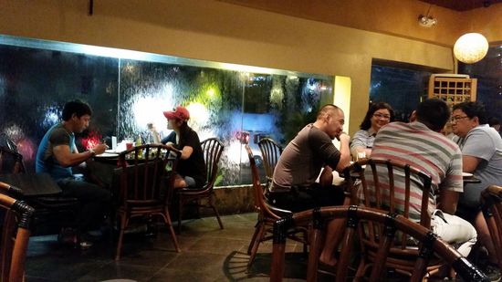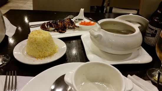 Das Restaurant war für seine Lage überraschend gut besucht. Ich hatte Glück, dass ich noch einen Platz bekommen habe. Als erstes habe ich eine sehr leckere Maiscremesuppe mit Meeresfrüchten gegessen, dann einen gefüllten Tintenfisch der gut war, aber die Füllung mit relativ vielen dieser hier typischen kleinen Zitronen hat mir nicht so ganz zugesagt. Aber das ist ja Geschmackssache. Dafür gab es eine ganz dicke leicht süßlich Soße auf Basis von Sojasoße dazu die wieder lecker war und den üblichen gekochten Reis. Und dann habe ich als Nachtisch noch einen Fan mit doppelt Schokolade (so würde ich es übersetzten) genommen. Enorm schwer und auch noch mal richtig lecker. Zum runterspülen zwei der üblichen San Miguel Pilsen. Das ganze hat dann knapp 500 P gekostet. So geht es auch.