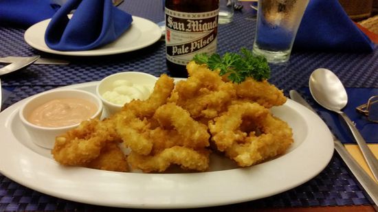 Die beiden haben für sich im Los Amigos reserviert weil es da heute Livemusik gibt, aber wir trennen uns erst einmal. Ich gehe ins Sans Rival, das mir schon von der Aufmachung her sehr gut. Die Calamari sind tatsächlich eine mords Portion. Allerdings haben sie auch einen Beigeschmack, irgend ein Gewürzt in der Parade, die der mir nicht so recht behagt. Ich schaffe die Portion für 180 P auf jeden Fall nicht.