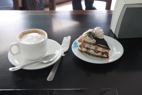 Zum Frühstücken gehe ich heute ins Sans Rivale. Ausgeschenkt habe ich bereits vorher und den Koffer an der Rezeption abgegeben. habe Das Kaffee gefällt mit von der Einrichtung her genauso gut wie das Restaurant. Ich nehme mir eine Torte mit einer Art Erdnussbaisser. Etwa gummiartig, aber ganz lecker.