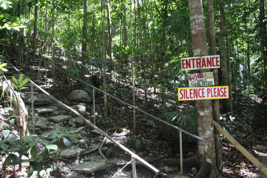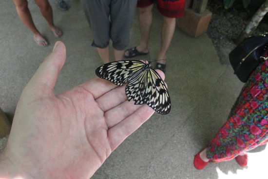Nächster Stopp war die Schmetterlingsfarm, die sowohl Peters in seinem Handbuch, als auch Stephan empfehlen. Nunja, ich kann mich der Empfehlung nicht anschließen. Wenn ich an die tollen Schmetterlinge in den Cameron Highlands in Malaysia denke, und dann das hier? Wir werden von einem Spaßvogel durch geführt, der anzügliche Witze erzählt und an sonsten nicht viel zu zeigen hat. Interessant ist nur eine riesige Motte die am Netzdach hängt. Dann bringt er noch zwei große schwarz-weiß gemusterte Schmetterlinge die wohl besonders flugfaul sind und sich auf die Hand setzten lassen. Das war es auch schon.