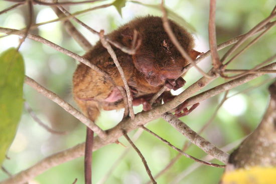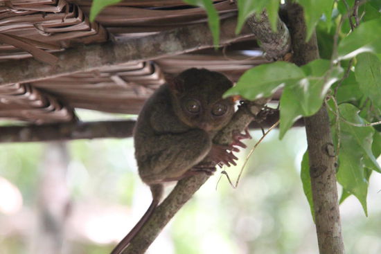 Langsam meldet sich bei der Gruppe der Hunger, aber erst kommt noch das zweite Highlight der Tour, die Tarsier, die kleinste Primatenart der Welt. Sie sind Nachtaktiv und so klein, dass wir sie nur dank Hinweisen der Parkangestellten und einer Art kleinen Dächern, unter denen sie tagsüber schlafen, sehen. Dadurch sind sie leider wegen den Schatten noch schlechter zu sehen, aber immerhin. Eine Parkhüterin sagt mir, dass sie zur Zeit acht Tiere hier haben. 4 davon sehe ich. Den Rest kann ich nicht finden. Immerhin macht einer einmal die übergroßen Augen auf und schaut mich an. Das ist ein ganz nettes Foto.