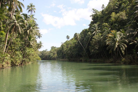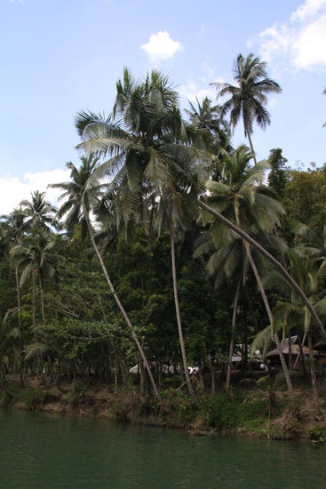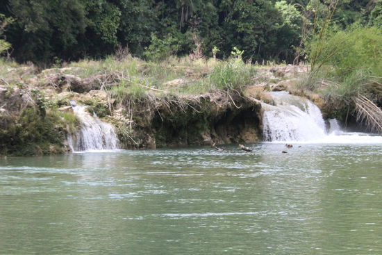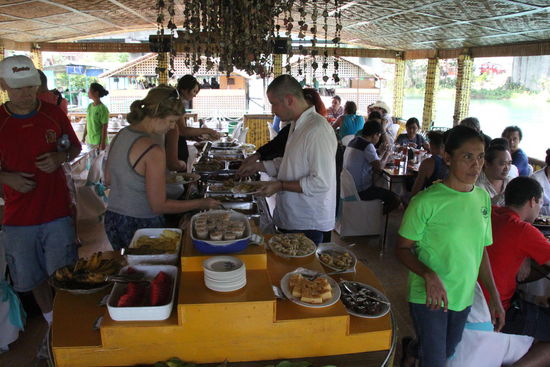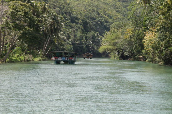 Danach ist dann auch das Mittagessen dran. Es gibt eine Flussfahrt mit Buffet. Die Landschaft ist ganz schön. Sie erinnert mich ein bisschen an meine Schifffahrt durch Kerala in Indien. Nur dass hier jede Menge der Boote unterwegs sind. Das Essen taugt nicht viel. Die Schwedinnen essen so gut wie nichts. Ich finde es langweilig nur die eine der beiden Deutschen, die schon zum dritten Mal auf den Philippinen ist, findet es gut. Die Schwedinnen holen sich als erste ein Bier, ich mache es ihnen nach (kostet 60 P extra zu den 450 die diese Bootsfahrt extra kostet), dann folgt noch ein Pärchen. Ich erinnere mich noch, dass mein Kumpel mir bei irgendeiner Gelegenheit die Bootsfahrt empfohlen hat mit den Worten, das sie bis zu Wasserfällen geht. Als wir um eine Biegung fahren muss ich lachen. Die Wasserfällchen sind maximaler 2-3 Meter hoch oder so, aber da geht es halt nicht weiter. Als wir zum Aussteigen müssen wir dazu über ein Boot das noch anliegt. Die Gäste dort haben genau das gleiche Essen. Also reine Massenabfertigung.