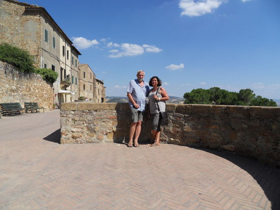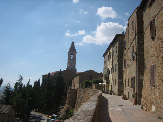 Sie liegt auf einem Hügel und wir haben sie schon bei der Herfahrt in der Ferne bewundert. Besonders interessiert mich die Piazza Pius II, der Platz mit der raffinierten Perspektive des umgekehrten Fluchtpunktes. Er wurde so angelegt, um die Ausmaße, die auf der Hügelkuppe beschränkt waren, größer erscheinen zu lassen. Die Piazza wird dominiert vom Dom und jeweils einem Palazzo daneben. Wir setzen uns in ein Straßencafé direkt vor dem Dom, um die Schönheit dieses Platzes zu genießen – und einen leckeren Espresso. In den Gassen duftet es immer wieder würzig nach Käse, denn hier wir ein bekannter Schafskäse hergestellt.