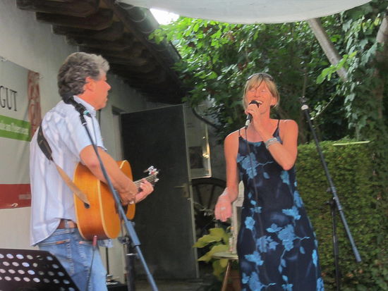 Wir starten gegen 12 Uhr, weil unsere Tochter noch zum Frühstück bei uns war. Aber die erste Etappe ist sowieso sehr kurz. Wir wollen bei Alzey im KulturGUT in Bechtolsheim das Sommerfest besuchen. Roland Kalus und Frau haben sich hier der Musik verschrieben, geben Unterricht (Gitarre und Gesang) und organisieren Veranstaltungen.