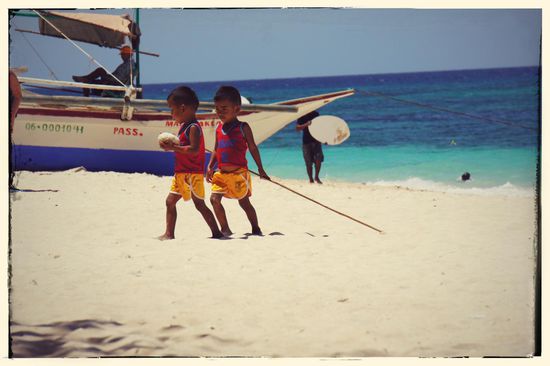 Heute waren wir um 11:00 Uhr mit Nisa und Iva an der Lobby verabredet, weil wir gemeinsam zum im Norden der Insel gelegenen Puka Beach wollten. Angeblich gäbe es dort keinerlei Algen und auch weniger Touristen. Mit dem hoteleigenen (kostenlosen) Elektrotrycicle gings pünklich los, wie immer war auf der Hauptstrasse schon ordentlich Verkehr. Sobald man die erste Reihe (also den White Beach) verlässt, sieht man etwas vom tatsächlichen Leben der Philippinos, aber auch wie ärmlich viele dort leben. Gute 20 Minuten später waren wir am Puka Beach angekommen - ein Traum von Strand. Es gibt keine durch Hotels verbaute Kullisse, keine Rund-um-die -Uhr Beschallung und so gut wie keine Strandverkäufer. Einfach nur weißer Sand, türkisblaues Wasser -völlig ohne Grünalgen-, und jede Menge Palmen und chillige "Native-Bars". Hier kann man es prima aushalten. Noch ist der Puka Beach im vergleich zum White Beach geradezu lächerlich besucht, aber dies wird sicherlich auch nicht mehr lange so bleiben, zwei Hotels sind bereits im Bau.