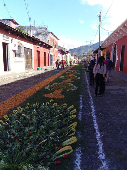 Es herrschte eine Art Ausnahmezustand, da alle Straßen mit Menschen überfüllt waren, sich Schlangen vor den Restaurants bildeten und die Einheimischen vor ihren Haustüren riesige Teppiche/Bilder aus Blumen und Gräsern errichteten.
