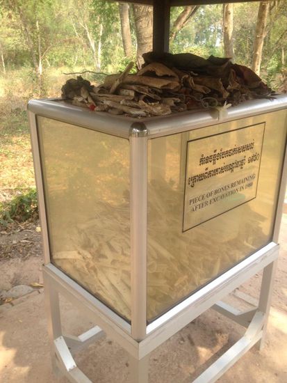 Ähnlich wie in den Konzentrationslagern wurden in dieser Anlage von 1975 bis 1979 durch die kommunistische Roten Khmer 20.000 Menschen umgebracht, die nicht den idealen von dem Führer Pol Pot entsprachen. Er wollte ein Agrarkommunismus erschaffen und löschte deshalb die gesamte Elite, Lehrer, Dozenten und Professoren aus. Es genügte bereits das Tragen einer Brille. Insgesamt wurden so in mehr als dreihundert Killingfields ungefähr 200.000 Leute systematisch umgebracht. Die Gesamtzahl der Opfer der Roten Khmer wird auf 3 Millionen Menschen (von ursprünglich 8 Millionen Kambodschanern)geschätzt. Durch einen Audioguide wird man durch die Anlage geführt. Hier erfuhr man, dass die zum Tode verurteilten Menschen, um Geld zu sparen nicht mit Munition umgebracht worden sind, sondern meist erschlagen wurden. Babys und Kleinkinder wurden vor den Augen der Mutter bis zum Tod gegen einen Baum (Killingtree) geschlagen und die Mutter dann anschließend vor den Massengräbern getötet. Zwar sind die meisten Gräber geborgen worden doch trotzdem sieht man überall Knochen und Kleidungsstücke die immer noch durch Regen und Erosion zum Vorschein kommen. Wirklich ein schrecklicher Ort und unvorstellbar das dies vor 40 Jahren passiert ist. Vor der Rückfahrt mit dem gleichen Motorradfahrer bat ich ein wenig langsamer zu fahren. Gott sei Dank hat er mich wohl verstanden…nur ein Beinahunfall.