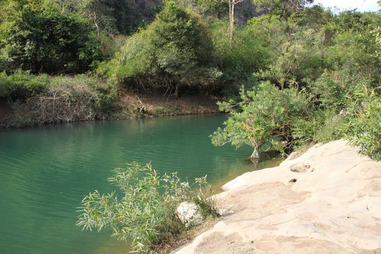 Im Dezember herrscht in Laos Trockenzeit und dies macht sich deutlich am Wasserstand der Flüsse bemerkbar. In der Höhle, die man sonst wohl eher durchschwimmen oder mit einem kleinen Boot durchqueren muss, bekamen wir zwar nasse Füße aber das schwimmen konnten wir uns sparen.