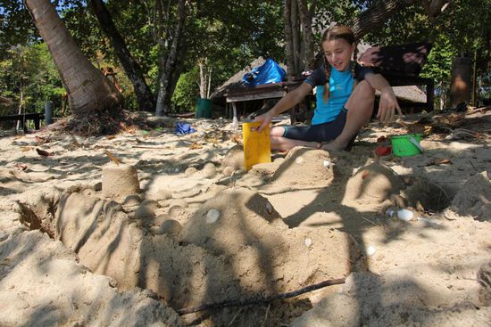 Eingelebt hatten wir uns schnell und vor allem die Kinder waren von der ersten Minute am Strand nicht mehr fort zu kriegen. Tim musste man regelrecht bestechen, damit er mal aus dem Wasser kam um sich wieder aufzuwärmen. Ronja bevorzugte die trockenere Variante des Wassersports, denn auch wenn sie oft schwimmen war, war sie total versessen auf das Kanu fahren. Da die Kinder wunderbar am Strand spielen konnten, konnten wir Erwachsenen es uns durchaus auch mal erlauben, den einen oder anderen längeren Spaziergang in die Ausläufer des Dschungels zu machen oder die Seele bei einer Massage baumeln zu lassen.