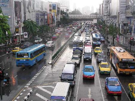 Check out fuer unser Zimmer ist zwoelf Uhr. Daher geben wir alles Gepaeck beim Pagen ab. Den Koffer koennen wir 3 Wochen im Hotel stehen lassen, unsere gepackten Rucksaecke holen wir in 3 Stunden wieder ab. Auf gehts mal wieder in den Trubel Bangkoks. Einmal zum Wat Pho quer durch die Stadt und das alltaegliche Verkehschaos. Endlich haben wir einen Taxifahrer erwischt, der Englisch spricht. So vergeht die halbe Stunde Fahrt angenehm schnell. Wie jeder Thai weiss auch er, das naechstes Jahr die Fussball WM in Deutschland statt findet. FC Bayern Muenchen und die Scorpions sind fuer ihn ebenso wenig unbekannte. Der Wat Po ist eine Riesentempelanlage mit dem beruehmten liegenden Buddha, die Kinder in der Schule neben dem Buddha stoeren sich nicht mehr an der Anwesenheit von Scharen an Touristen. Einmal um den Kaiserpalast gelaufen und weiter gehts zum Shoppen. Wir brauchen fuer heute Abend noch einen Laos Lonely Planet, ein Moskitonetz und einige andre Sachen. Die Nachfrage bei den Taxlern endet im Chaos. Die ersten beiden verstehen uns nicht, wir sie nicht. Der dritte scheint uns verstanden zu haben und will uns dorthin fahren, wo wir die Sachen besorgen koennen. Eine Vorahnung macht sich breit, als er zum ersten mal anbietet, uns zum besten Edelsteinhaendler der Stadt zu fahren. Wir lehnen dankend ab und aendern unser Fahrtziel kurzerhand auf das MBK, in der Hoffnung, fuendig zu werden. Einkaufszentren in Bangkok uebertreffen alles, was wir in Deutschland kennen. Ueber 7 Etagen reihen sich hier gleich 3 Kaufhaueser nebeneinander, die Verbindungswege fuehren ueber Bruecken ueber das alltaegliche Verkehrschaos in der Stadt.