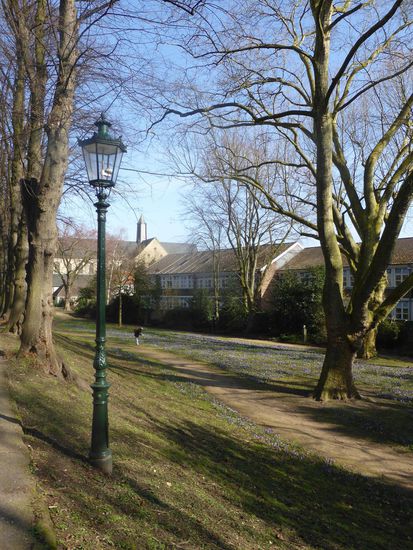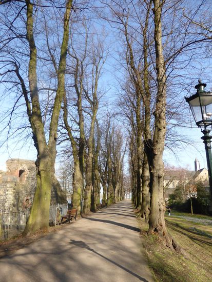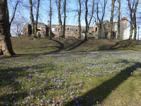 Die Allee an der Kaiserpfalz führt uns an einer wunderschönen Krokuswiese vorbei direkt zur Suitbertus-Basilika. Ende des 7.Jh. überließ Pippin dem angelsächsischen Missionsbischof Suitbertus das Gelände als Stützpunkt für die Missionierung des rechtsrheinischen Gebietes. Suitbert gründete hier ein Benediktinerkloster und starb in Kaiserswerth am 1. März 713.
