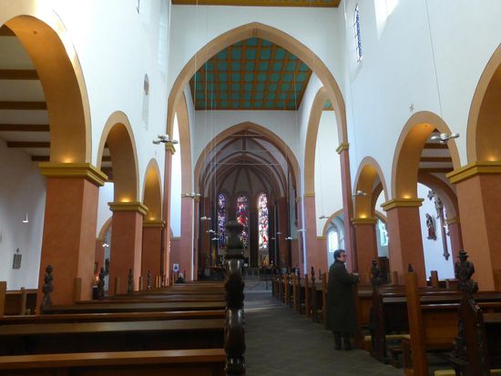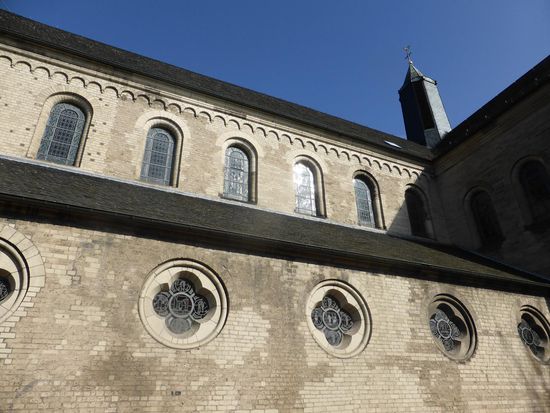 Die dreischiffige Suitbertus-Basilika liegt zwischen Pfalz und Stadt inmitten der ehemaligen Stiftsimmunität.