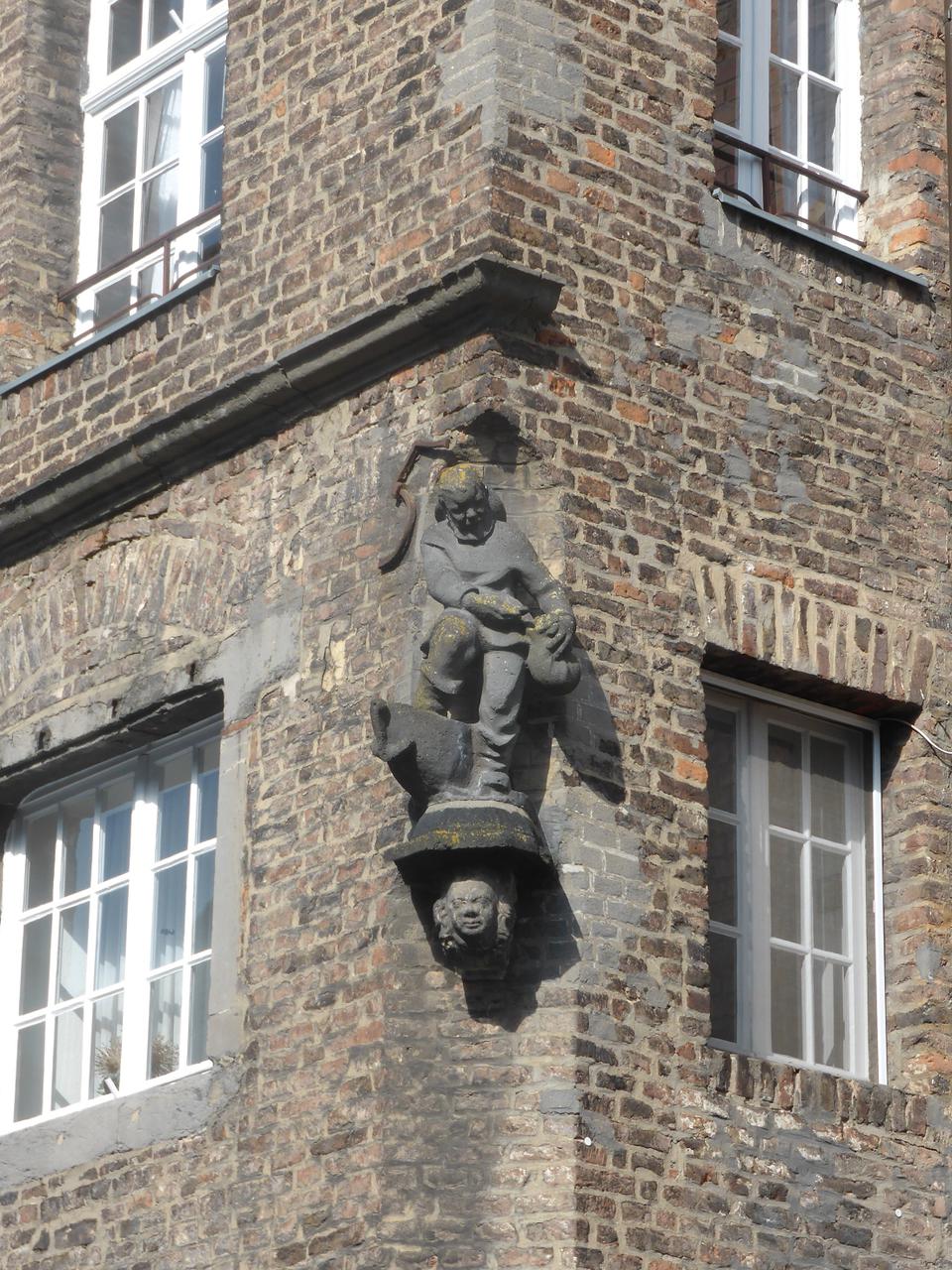 an der rechten vorderen Gebäudeecke ist die Zöllnerplastik von Bernhard Lohf angebracht.