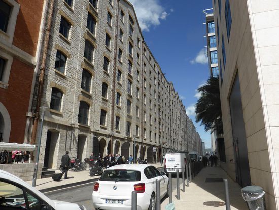 Der nächste Programmpunkt liegt wieder am anderen Ende der Tramlinie: Am Place Joliette liegen sowohl die Docks mit Speichergebäuden, die wohl erst Ende des Jahres innen fertiggestellt werden. Ulrike schickt mich jedoch einmal rum, da sie meint, gesehen zu haben, dass hinten der Eintritt sei.