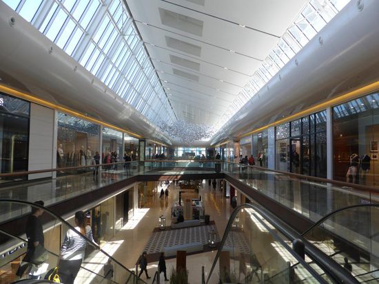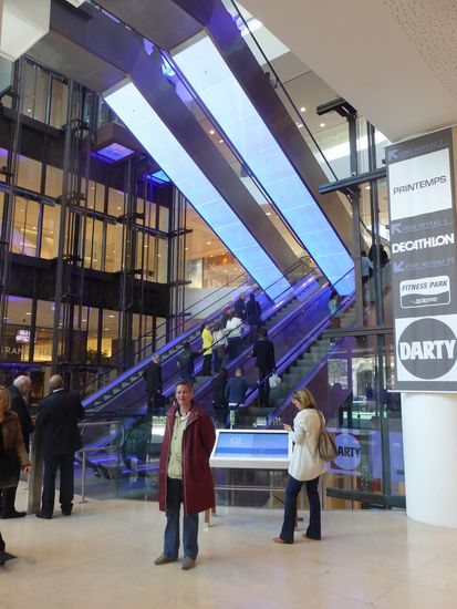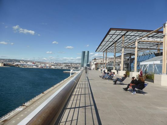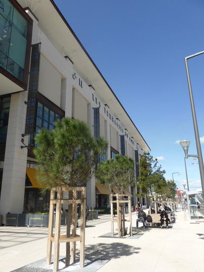 Direkt gegenüber liegen die völlig neuen Terrasses du Port, eine supermoderne Mall, in der wir zunächst einmal einen Snack in Form eines Stückes Schokoladentorte ( für uns beide fast zu mächtig) mit Tee und Kaffee zu uns nehmen, bevor wir einen Bummel durch die Shopping-Meile machen.