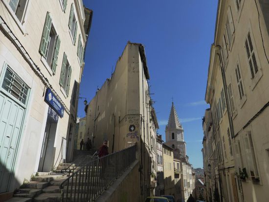 An der Notre-Dame-des-Accoules beginnt der steile Aufstieg über Treppen ins Panier-Viertel. Es gibt mal wieder einen Seifenladen – der hat diesmal die Seifenquader und –Platten an Schnüren.