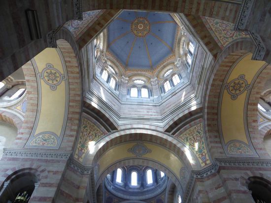 Die im vorderen Teil dreischiffige Kirche wird neben dem Chor fünfschiffig mit sehr großem Chorumgang und noch einigen recht großen Nebenkapellen, die wie eigenständige Kirchen wirken. Der Stil - ‚quergestreift’- mit verschiedenfarbigen Marmorblöcken ist eigentlich Italien vorbehalten.