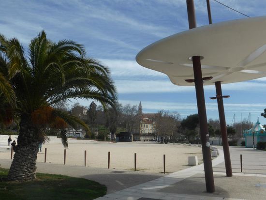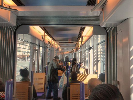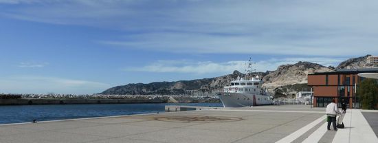 Mit der hochmodernen Tram T2, die, wie man wohl auch in Aachen wollte, in manchen Straßen den gesamten Verkehr auf einspurige Bahnen zurückdrängt fahren wir drei Stationen bis Joliette. Als wir aussteigen fällt Ulrike sofort der um die Ecke stehende Bus 35 auf, den wir nehmen müssen. Er wartet noch ein wenig auf weitere Passagiere und bringt uns dann in weniger als 20 min am neuen Hafen vorbei nach l’Estaque.