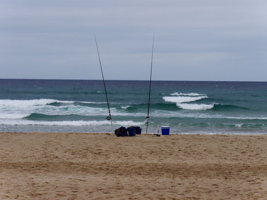 Schließlich erreichen wir das Meer. Endlose, bereite Sandstrände, Menschen leer erwarten einen in diesem Land. Leider läd das Meer nicht zum Baden ein. Hohe Brandung, gefährliche Unterströmung und Haie im Wasser, sprechen eindeutig dagegen. Wir spazieren eine ganze Weile am Strand entlang. Der Wind pustet ordentlich und der aufgepeitschte Sand, beschert uns ein kostenloses Peeling. Vereinzelt sieht man echte Kerle mit ihren Mega-Angeln in der Brandung stehen.
