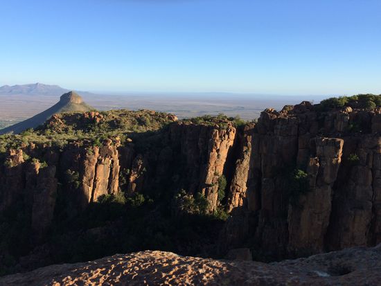 Nachdem wir den historischen Stadtkern erkundet haben, brechen wir auf in den Camdeboo NP. Das Valley of Desolation ist hier landschaftlich die Hauptattraktion. Nachmittags um 16:00 sind wir da uns auch die einzigen Menschen vor Ort. Hmmm, ich erinnerte mich im Reiseführer etwas von unbedingtes "Must See" gelesen zu haben? Wir verweilten an den Viewpoints und genossen die fabelhafte Aussicht. Im Anschluß hatten wir die Empfehlung von "Reise Knoff Hoff" erhalten, den Lizard-Trail zu erwandern. Ein Rundwanderweg, der nur ca. eine Stunde dauern sollte. Doch brauchte man zum Begehen des besagten Rundweges pfadfinderische Qualitäten. Denn weder Weg noch Markierungen waren gut zu sehen. Trotz alledem hat sich die Anstrengung gelohnt und wir genossen zwischendurch immer mal wieder schöne Aussichten. Zum Ende haben wir dann aber abgekürzt. Waren wir doch schon viel länger unterwegs als beschrieben und ein Weg war beim besten Willen nicht mehr zu erkennen. Quer Feld ein ging es bis wir zufällig mal wieder auf eine Wegmarkierung stießen. Inzwischen war es 17:30. Der Sonnenuntergang sollte hier besonders sehenswert sein. Leider dauerte es noch eine ganze Weile bis dahin. Je später es wurde, desto mehr Menschen fanden sich am Viewpoint ein. Da der Wind zwischenzeitlich ganz schön aufgefrischt hatte, beschlossen wir den Sonnenuntergang nicht mehr abzuwarten und nach Hause zu fahren. Für 20:00 hatten wir einen Tisch bestellt. Wir haben dazu gelernt. Bekommst du eine Restaurantempfehlungen, bestelle einen Tisch, sonst guckst du in die Röhre.