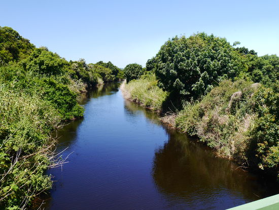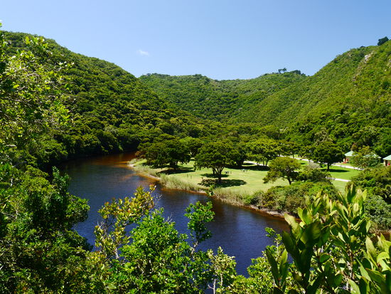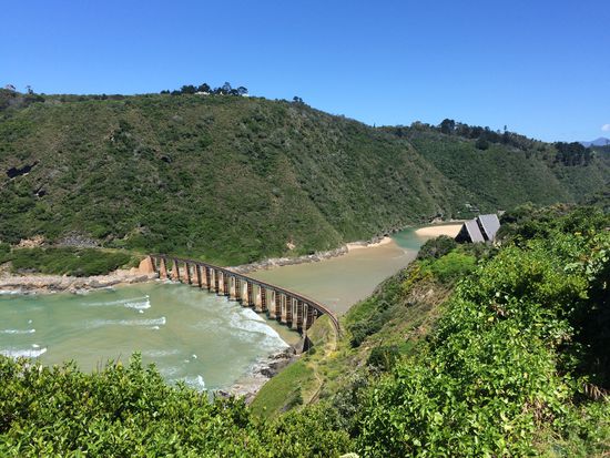 Mündung des Kaaimans River mit der Eisenbahnbrücke über die bis vor einigen Jahren noch der legendäre Outeniqua Choo-Thor mit beindruckendem Dampfausstoß fuhr.