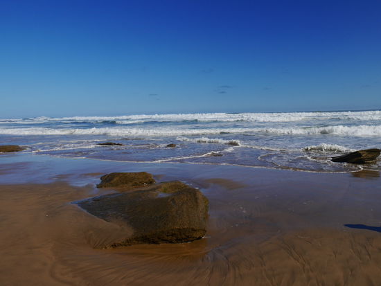 Nachdem die erbeuteten Waren im Kühlschrank verstaut waren, setzten wir uns ins Auto und fuhren zum Gate des Garden-Route NP Sektion Wilderness. Ein kleiner Hike war geplant. Es wurde auch nur ein kleiner. Aber feiner! Es ging schön im Schatten, immer am Touw-River entlang. Danach machten wir uns auf zu neuen Ufern. Nämlich dem Ufer des Island Lake. In Südafrika ist es so, dass an jeder auch nur halbwegs schönen Stelle eine Grill Möglichkeit vorhanden ist. Da dies aber eine sehr schöne Stelle war, gab es gleich mehrere Grill Möglichkeiten und überdachte Bänke und Tische. Ja, ja, die Südafrikaner, ein Grill freudiges Volk.Andreas nutzte die Gelegenheit, zu einen erfrischenden Bad im See. Endlich mal ein Gewässer, dass einem nicht gleich die Beine wegreißt. Trotzdem haben wir bevor es nach Hause ging noch einmal die Straßenseite gewechselt und dem tosenden Meer noch einen Besuch abgestattet. Schließlich ist hier in Wilderness für uns die letzte Gelegenheit wenigstens nochmal die Füße in den Ozean zu halten, ohne das sie auf der Stelle abfrieren.