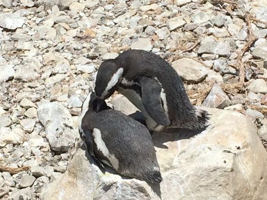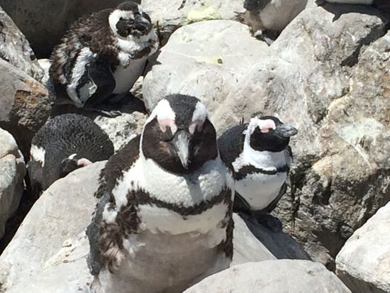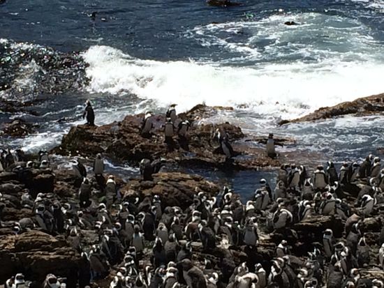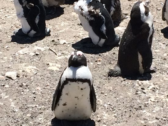 Nach unserem beinahe Walerlebnis gehen wir beschwingt nach Hause um unsere Siebensachen für den heutigen Tag zu packen. Wir wollen nach Betty's Bay und den niedlichen kleinen Pinguinen einen Besuch abstatten. Im Stony Point Nature Reserve ist eine von zwei Pinguinkolonien in Südafrika. Dort leben die Afrikanischen Pinguine. Sie werden auch Sea Donkeys genannt, weil ihr Schrei wie ein Esels I-Ah klingt. Hunderte dieser kleinen lustigen Kerle stehen da rum. Die meisten sind in der Mauser und sehen deshalb ziemlich zerrupft aus. Da sie in der Zeit der Mauser nicht ins Wasser können und somit auch keine Möglichkeit haben Fische zu fangen, bedeutet das zweierlei. Erstens, sie haben Langeweile und stänkern deshalb auch gerne mal mit dem Nachbarn. Zweitens, sie haben Hunger und ich kann aus Erfahrung sagen, das macht schlechte Laune. Ergo, es wird noch mehr gestänkert. Die paar, die mit der Mauser schon durch sind, sind die einzig aktiven. Sie bahnen sich mühsam ihren Weg zum Wasser. Über Stock und Stein geht es, sich immer vor den hackenden Schnäbeln der "zerrupften Rumsteher" in acht nehmend. Dabei wird dem aufmerksamen Beobachter schnell klar, Pinguine können unmöglich Knie haben. Wenn ich also das nächste Mal abends nicht einschlafen kann und 4 von 5 Stimmen in meinem Kopf sagen, dass es Zeit zum Schlafen ist und wieder nur die Fünfte fragt, ob Pinguine eigentlich Knie haben, kann ich das jetzt beruhigt mit NEIN beantworten.