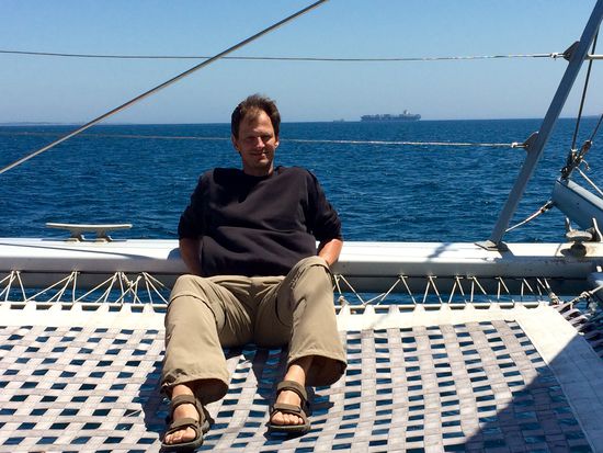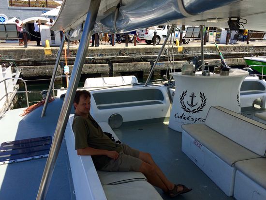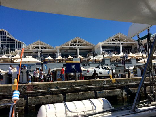 Wir führen an die Waterfront und parkten das Auto. Was wir machen wollten war noch etwas unklar. Boot fahren? Hubschrauber fliegen? Keine Ahnung. Wer Zuviel Angebot hat, tut sich schwer in der Entscheidungsfindung. Um 11:00 startete eine 1,5 stündige Katamaran Fahrt vor Kapstadts Küste. Das klang in Anbetracht der Wetterlage verlockend. Zeit für ein Frühstück war auch noch drin. Perfekt! So sind wir also zu Quey Four gestiefelt und haben mit Aussicht auf die Hafenbecken unser Frühstück genossen. Um 11:00 ging es zum Boot. Ein großer Katamaran, ausgelegt für 60 Personen, aktuell belegt mit rund 20 Personen, brachte uns pünktlich raus auf's Meer. Eine 10 köpfige afrikanische Reisegruppe sorgte für lautstarke Unterhaltung. Warum müssen die Afrikaner eigentlich immer so schreien? Jeder hat ein Handy in der Hand und trotzdem schreien sie sich permanent in einer Lautstärke an, als sei ihr Gesprächspartner 3 Orte entfernt. Andreas' Theorie ist die: die wurden alle in einer Großfamilie groß und mussten sich frühzeitig Gehör verschaffen. Das geht nur durch schreien. Ok, leuchtet ein.