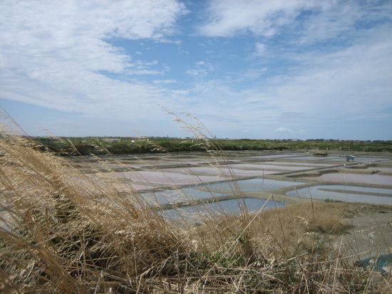 Heute ist dort Markt, auch ein recht großer. Wir sehen uns die Stände an und Wolfgang kauft ein paar lederne FlipFlops. Zudem entdecken wir eine nette Creperie, wo wir gleich kurzerhand einen Tisch für abends reservieren. Danach setzen wir uns eine Weile ans Meer, bevor wir uns wieder auf den Rückweg durch die Salinen machen. Der Rückweg wird mir bzw. meinem malträtierten Rücken dann doch ziemlich lang und ich bin froh, mich endlich am Campingplatz in meinen Stuhl in der Sonne sinken lassen zu können. Nun ist noch ein wenig Lesen und Faulenzen in der Sonne angesagt.