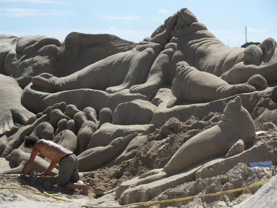 Einen Stopp machen wir noch in Pornichet, wo ein paar Künstler gerade dabei sind, eine phantastische Landschaft mit Meerestieren aus Sand zu modellieren. Wir hatten in der Tageszeitung davon gelesen. Eindrucksvoll! In Le Poliguen ist Markt, obwohl es doch schon recht spät am Nachmittag ist. Parkplätze sind Mangelware, so dass wir schließlich unverrichteter Dinge weiterfahren.