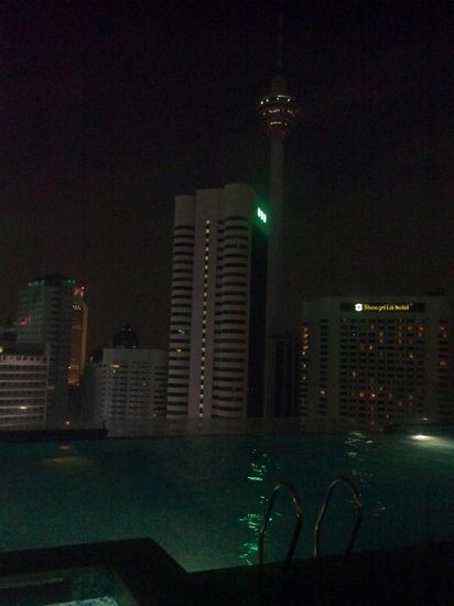 An den Petronas Twin Towers laufen wir erstmal ein wenig rum und staunen, machen zusammen mit hunderten anderer Menschen Fotos aus allen Perspektiven, schlendern durch die Shopping Mall (wird es nicht endlich Zeit für ein damenhaftes Prada-Täschchen? Oder lieber Gucci? ) und sitzen dann am See und gucken uns die beleuchteten, musikalisch unterlegten Wasserspiele an. Vergesst die (ehemals Bonner) Klangwelle: das hier ist super!!! Als uns dann auch langsam die Augen zufallen (im Flieger schlafen klappt einfach nicht richtig) machen wir uns auf den Rückweg und fahren noch kurz in den 18.Stock unseres Hotels, um uns den Pool anzuschauen...Wahnsinn! Warum hab ich keinen Bikini an? Naja, wahrscheinlich weil wir jetzt vor Erschöpfung eher ertrinken würden. Aber morgen auf jeden Fall! Morgen wollen wir die Stadt erkunden und ganz früh direkt auf den Fernsehturm.