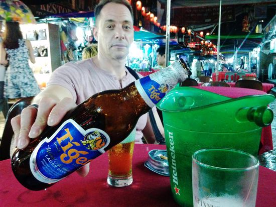Auf dem Rückweg zu Fuß finden wir auch zufällig endlich die Bukit Bintang, die Fressmeile von KL wo sich ein Restaurant an das nächste reiht und die Hölle los ist. Hier setzen wir uns auch nochmal hin und trinken ein Tiger und dann ist unser erster richtiger Tag in Kuala Lumpur auch schon zuende...