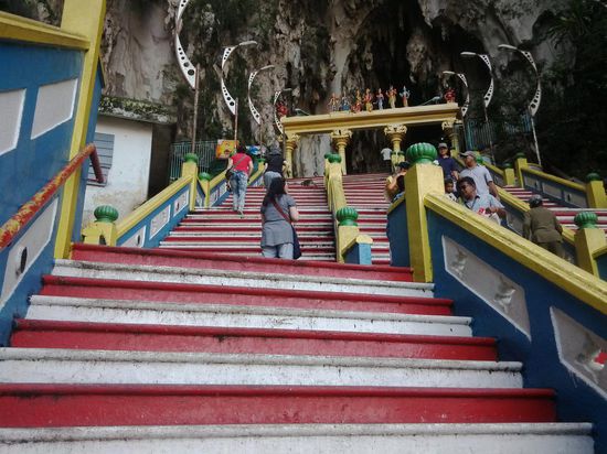 Und schon wieder diese unchristliche Zeit mit malaysischen Schlagern aber wir wollen zu den Batu Caves und das noch vor der Mittagshitze. Hinkommen ist wieder ganz einfach mit Monorail und Komuterzug und da sind wir schon, inmitten von Trillionen von Tauben und aufdringlichen Makaken die dir auch schon mal ganz gern an den Rucksack gehen wenn du lange genug ruhig stehst und in die andere Richtung guckst. Ich glaube ja, die tun sich zusammen: ein kleiner putziger kümmert sich um die Show "ooooh, how cute" während hinter dir die Großen abräumen. Peinlich, dass ich vergessen hab, dass man die Knie bedeckt haben muss und meine Shirts knapp über dem Knie endet. Die nette Dame am Eingang schlägt mirvor, einfach die Hose runterzuziehen statt einen Sarong zu leihen, was dazu führt, dass ich die ganze Zeit meine Hose festhalte weil ich Angst habe, sie zu verlieren.
