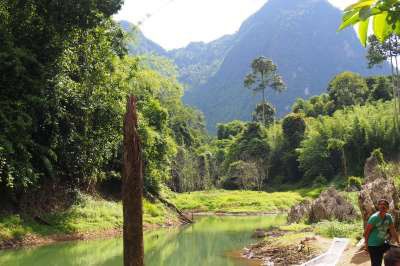 Nach nochmals 5 min. per Boot dann eine intensivere Wanderung durch den Dschungel. Festes Schuhwerk Grundvoraussetzung. ein bissel Kletterei, Durchquerung von Flüssen.und dann waren wir am Höhleneingang - Höhlen gibt es hier in großer Zahl, eben ein Karstgebirge.