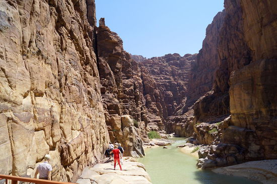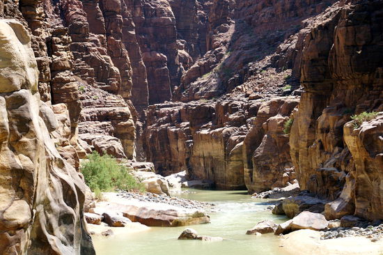 Am Toten Meer entlang geht es zum Wadi Mujib, das wie befürchtet gesperrt ist. Alleine die Schlucht von der Aussichtsplattform zu sehen ist noch beeindruckend. Auf dem Weg nach Dana fahren wir viele Serpentinen, quasi im Nirgendwo an der Straße gibt es eine Mini-Teestube, neben der man auf Bänken die Aussicht genießen kann.