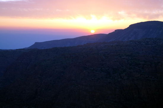 Das Guesthouse ist recht klein und hat vier Duschen, so daß wir uns wegen der Zeiten absprechen. Es ist direkt an das obere Ende der Schlucht gebaut, von Terasse und Balkonen hat man eine sehr schöne Aussicht. Ich sitze auf dem Balkon des Gemeinschaftsraumes, als kurz die anderen Gäste auftauchen, zwei ältere Schweizerinnen. Vor dem Abendessen bewundern wir auf der Terasse den Sonnenuntergang und fotografieren natürlich. Ilse und v. a. Claus fotografieren schon lange mit Spiegelreflexkamera und fotografieren dementsprechend mit viele mehr Erfahrung, Osama äußert sich eher unarabisch – despektierlich über „Knipser“ im Gegensatz zu Fotografen; die Jahre in Deutschland (zum Studium) haben doch ihren Eindruck hinterlassen.