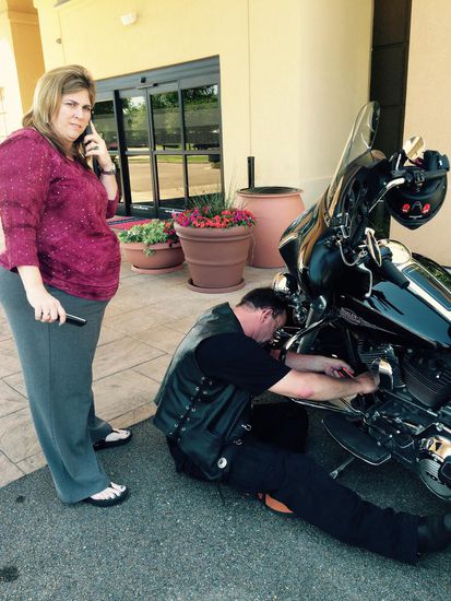Noch mal tanken noch schnell etwas Bargeld an einem Drive trough beziehen (ging aber nicht ohne abzusteigen) und weiter geht es - dachten wir. Wir fahren los und.....ich kann nicht in den 2. Gang schalten. Oh Schei....! Zum nächsten Hotel hier in West Point. Rein und gleich die Lady fragen ob sie für uns einen Anruf machen kann. Die nette Frau wählt sich die Finger wund. Am Schluss hat sie doch noch den Vermieter dran und erklärt was die beiden Individien für ein Problem haben. Wir sind gerade in einer Eagle rider freien Zone. Auswahl: Nashville oder New Orleans, beides 2.5 Std. entfernt. Na Toll! Es ist übrigens Samstag Nachmittag um 14.30 und am Montag ist Memorial Day. Entweder wir finden eine Lösung oder sitzen hier bis Dienstag fest. Wo ist der nächste Harley Dealer? Das wären über 90 Meilen, 1 Std. 20 Fahrt und es ist inzwischen bereits nach 15.00 Uhr. (Der Laden schliesst 17.00 Uhr!) Ach ja, im ersten Gang geht es ja etwas länger. Unsere Lady checkt mit dem Laden das wir kommen und falls es nicht vor 17.00 Uhr reicht soll ich anrufen damit ein Mechaniker bleibt. Wir wollen ihr etwas für den tollen Einsatz geben, aber sie weigert sich das Geld anzunehmen. it's my pleasure - ist ihre Antwort, schon wieder ein Engel.