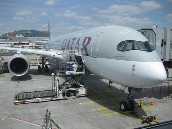 Zweiter Akt (steigende Handlung): Mit der DB läuft alles problemlos und wir sind pünktlich am Ziel. Der Flug ist noch nicht gelistet, also tanken wir mit großem Interesse an der sehr bunten Menschenmischung, die sich in einem großen Flughafen so zusammenfindet, noch Kaffee und Espresso und gucken dabei Leute. Qatar Airways erweist sich als flott und sehr freundlich beim Einchecken, so dass wir wieder Zeit haben, uns der Shoppingmeile des FF-Flughafens hinzugeben. Immerhin erstehe ich noch einen Kamm, meine Bürste hatte ich zuhause gelassen. Es folgt eine recht problemlose Security-Szene (Highlight: Kathi trifft eine Schülerin ihrer Klasse samt Mutter und Schwester). Ein wenig Abhängen im Gate und dann geht es los!