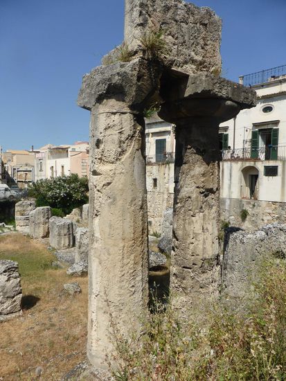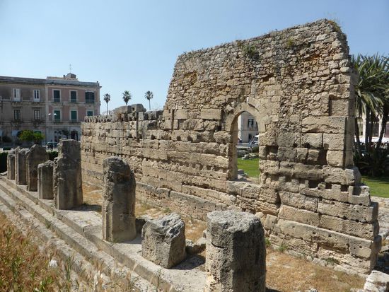 Unser Ziel ist der Apollotempel an der Piazza Pancali. Die Ruinen des ehemals dorischen Tempels sind eigentlich gar keine Ruinen, sondern sozusagen ein Denkmal an den Apollotempel aus den verbliebenen Resten des als Steinbruch von den Syracusaner genutzten zerstörten Tempels.