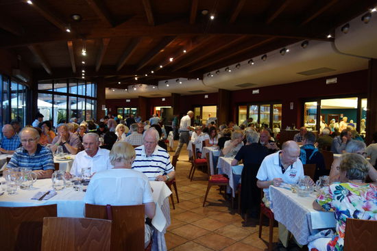 Für uns natürlich etwas gewöhnungsbedürftig ist der riesige Speisesaal, in dem ganze Busladungen sich auf das Buffet stürzen, das im übrigen umfangreich und abwechslungsreich dargeboten wird. Wein in Rot und Weiß, sowie Wasser und Softgetränke werden selbst gezapft. Mir fehlt zum Dessert nur der Kaffee, der nicht einmal bestellt werden kann.