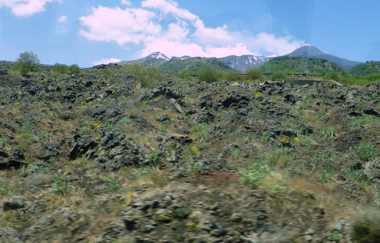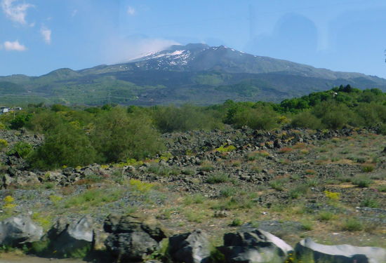 Auf dem Weg zeigen sich unterschiedliche Bilder vom Ätna. Elia zeigt uns einen Doppelkegel, den die Sizilianer den Busen von Sophia Loren nennen.