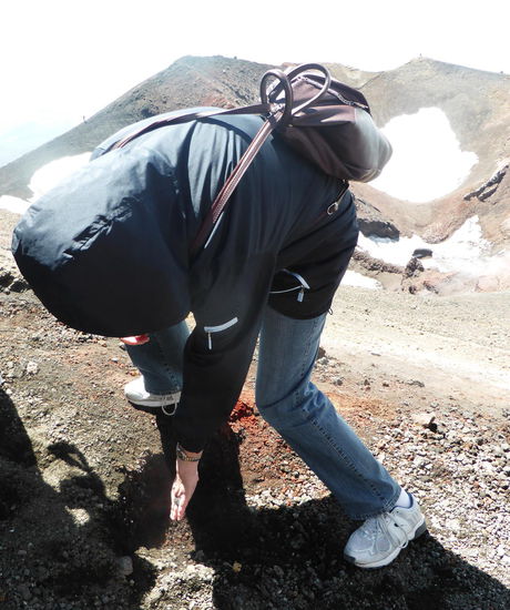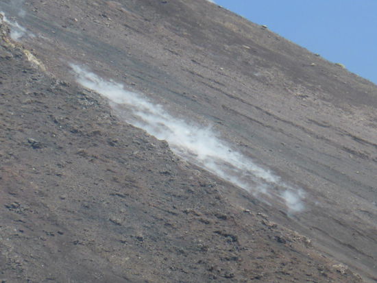 Den toten Seitenkegel mit Blick auf diverse andere können wir jedoch gefahrlos umrunden, wobei Elia uns immer wieder mit den Füßen ein Loch scharrt, in dem es deutlich wärmer ist. Er meint in 1 m Tiefe hätte es schon 200 Grad.