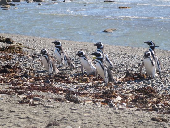 Ausnahmsweise haben wir aber Glück und eine Horde kommt gerade vom Fischen zurück und wartet watschelnd am Strand auf uns. Dann macht sich auch schon eine kleine Gruppe auf den Weg zu ihren Nestern und wir schauen ihnen fasziniert und amüsiert zu, wie sie schön in Reih und Glied hintereinander den Weg lang watscheln. Soooo süß!